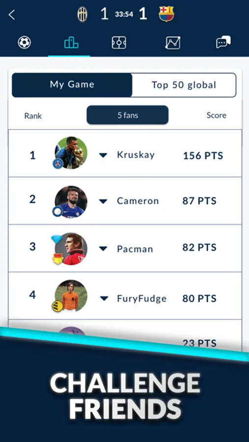 Follow your timeline to keep updated on all the points your players are earning. Your score goes up for every action your player completes in real-life - passes, tackles, interceptions and much more!