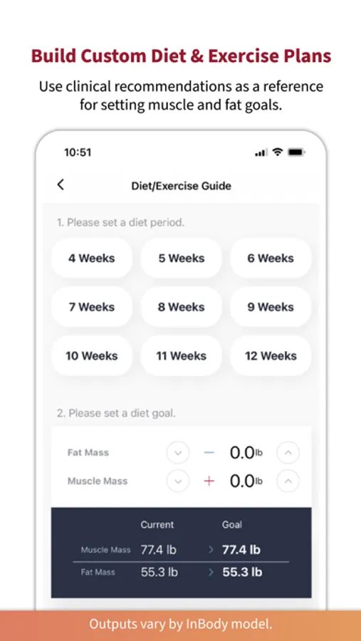 - A digital diet and exercise log that can be used to fit healthy changes into your current lifestyle. Within this section, you can also set attainable muscle and fat goals based on scientific data formulated by the InBody Clinical Research team. *Please note: The guide(s) are for reference purposes only and should not be taken as professional medical advice.