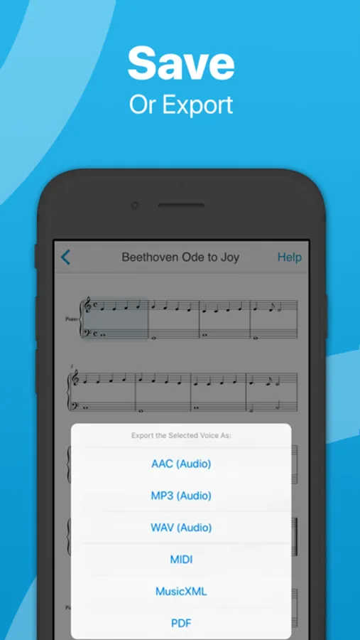 - Export as MIDI, MusicXML, audio (M4A / AAC, MP3, WAV), PDF to cloud storage, directly to other apps or via AirDrop