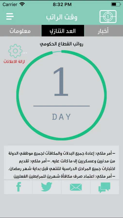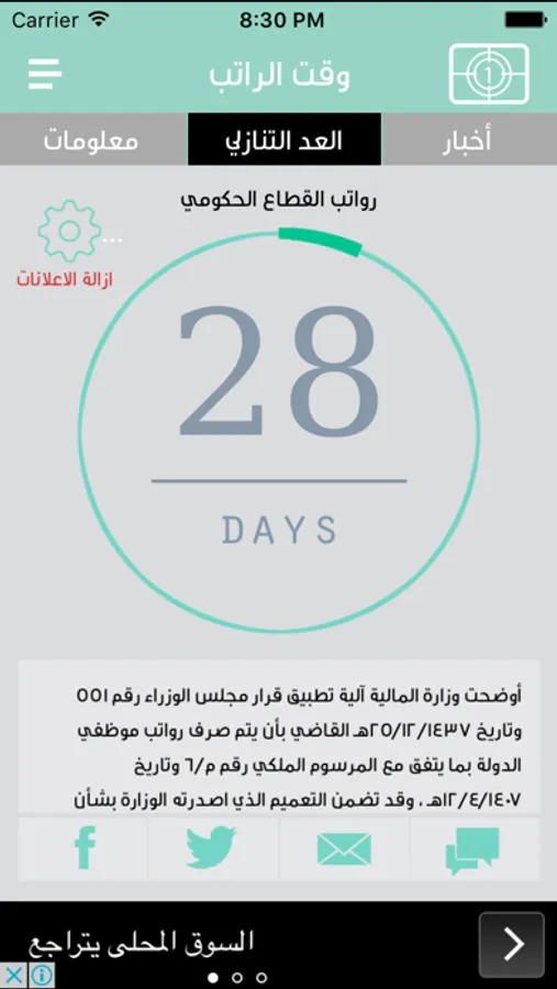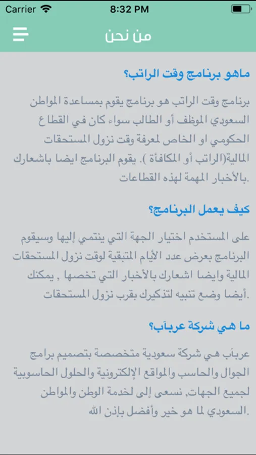 على المستخدم اختيار الجهة التي ينتمي إليها وسيقوم البرنامج بعرض عدد الأيام المتبقية لوقت نزول المستحقات المالية وايضا اشعارك بالأخبار التي تخصها , يمكنك أيضا وضع تنبيه لتذكيرك بقرب نزول المستحقات.