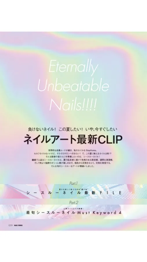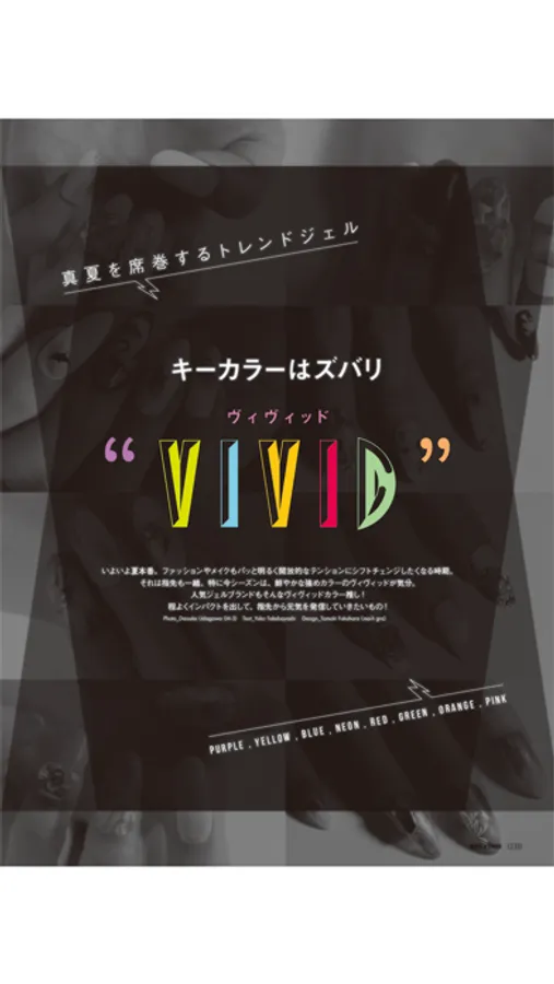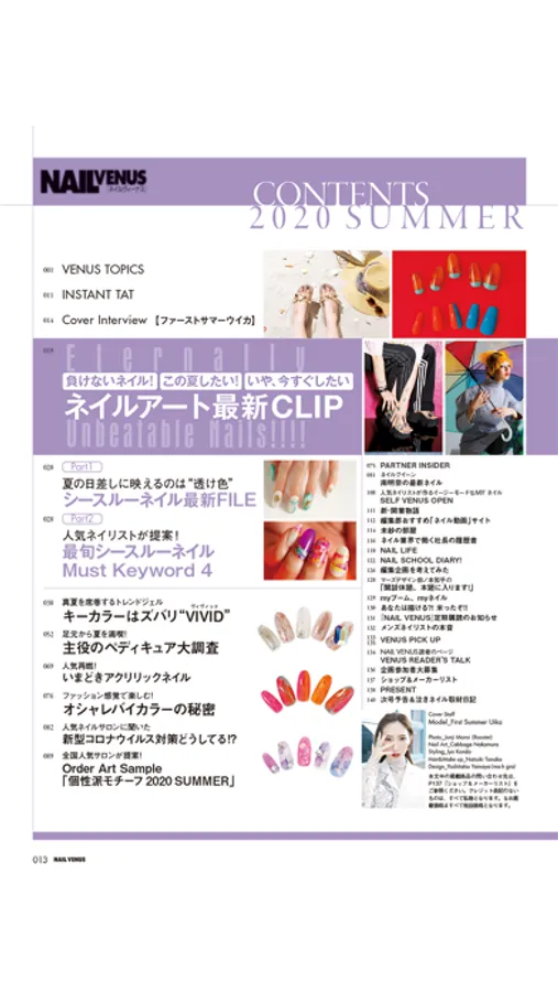 「セクシーでエレガント」なヴィーナスたちの新感覚ネイルマガジンネイルはファッションの一部であり、トータルファッションとして「カッコいいこと」を、なにより大事にしていきます。写真のクオリティ、ネイルデザインやスタイリングのセンス、トレンドをリードする情報。カリスマネイリストから趣味でネイルを楽しんでいる人まで楽しめる記事がもりだくさん。日ごろ一流のファッション誌を愛読している女性たちが満足できる「おしゃれ感」のあるネイル誌は、ネイルVENUSだけです。