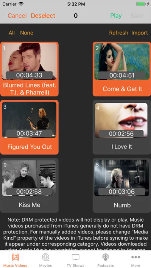 - Music videos downloaded via Apple Music subscription will not be displayed/played within the app due to restrictions. Purchased music videos generally do not have DRM protection/restriction.