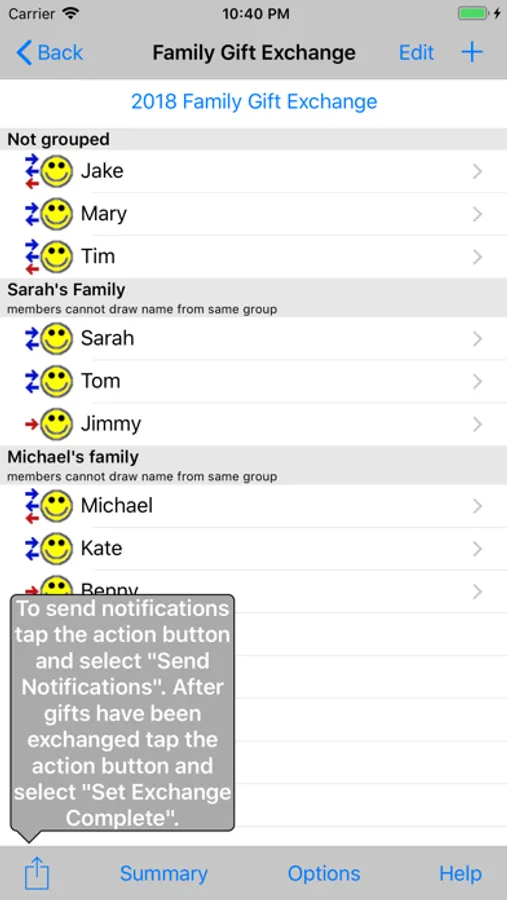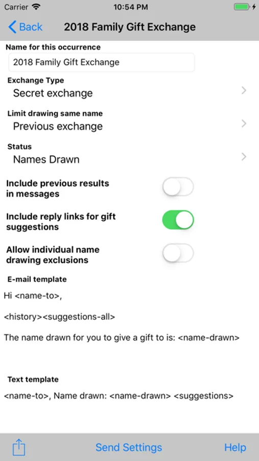 Each participant may be designated as "Gives and receives a gift in shared exchange", "Gives and receives in shared exchange, also may give to receive only participant(s)", "Does not receive gift, may give to receive only participant(s)", or "Does not give gift, receive only. For example, child". The results can be printed to an Airprint printer for each participant without email, or who want a printed copy. History display shows the name drawn and gift given for each person for previous drawings.