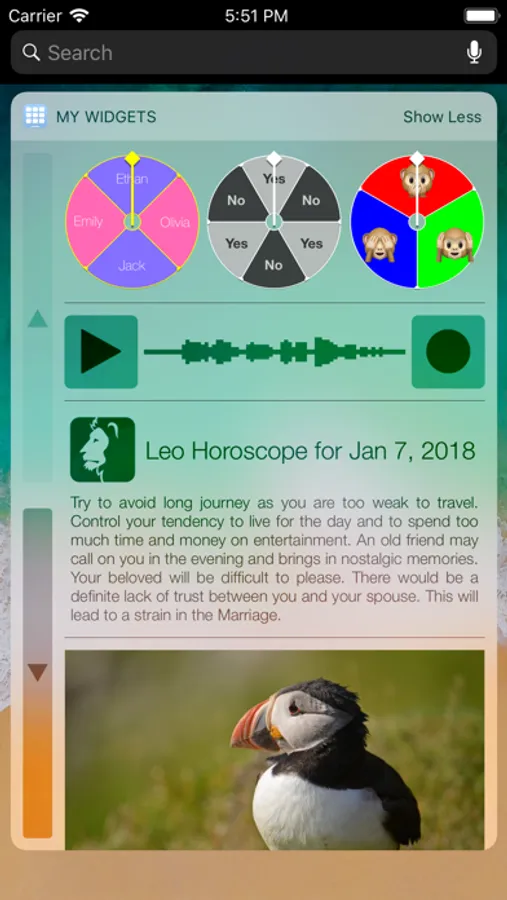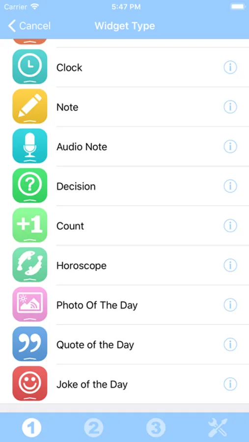 The application contains some free widgets like the Note widget allowing you to quickly view and edit some text notes and reminders and the Decision widget allowing you to randomly choose one item among several choices.