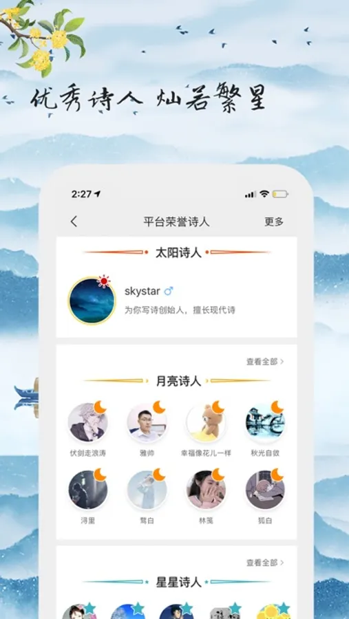 3, 加入诗歌社群,与优秀的诗人们一起切磋和交流。与来自天南海北的同道中人进行心灵的互动和精神的契合,想想都是一件美好的事情!更何况,我们还会每个月不定期举办"诗歌社群竞赛",与诗友们曲水流觞、竞写诗作,优异者不只会得到奖励,也会获得更多诗友们的青睐哦;