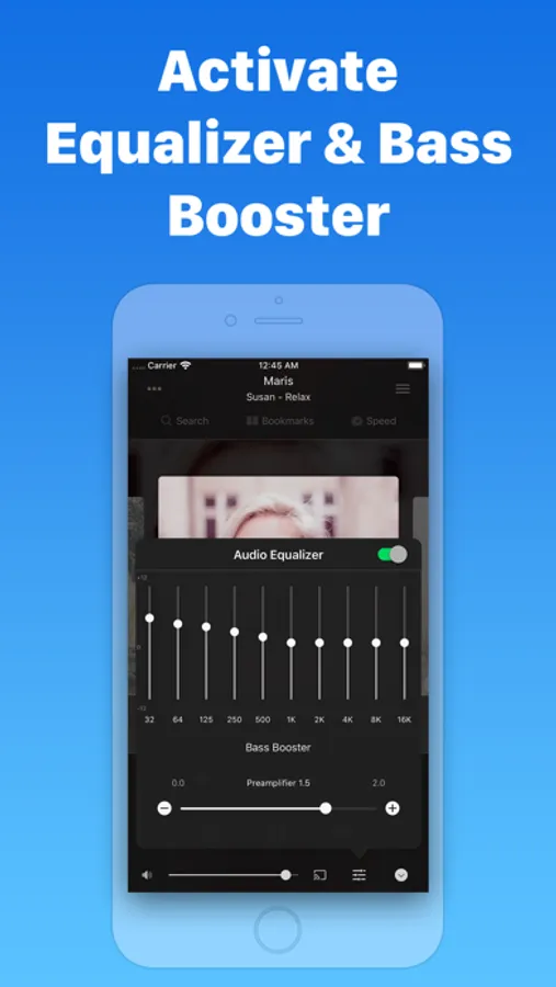 Audio equalizer. This app has built in equalizer with different presets for the most popular music genres. But you can also select manual equalizer settings and change preamplifier gain if you need to make your music louder.