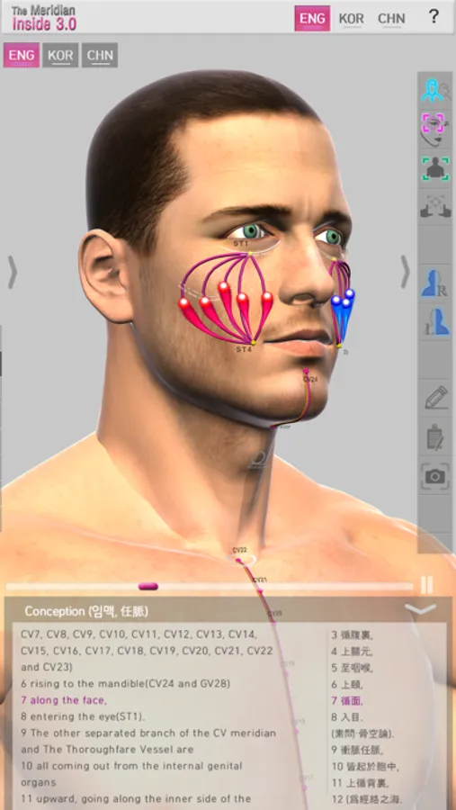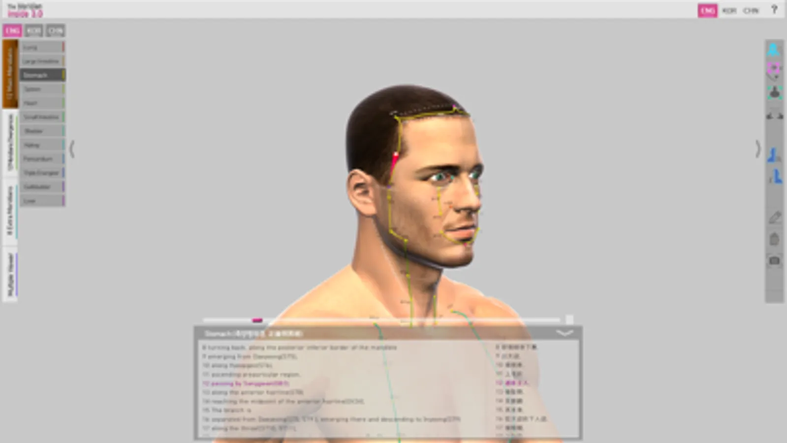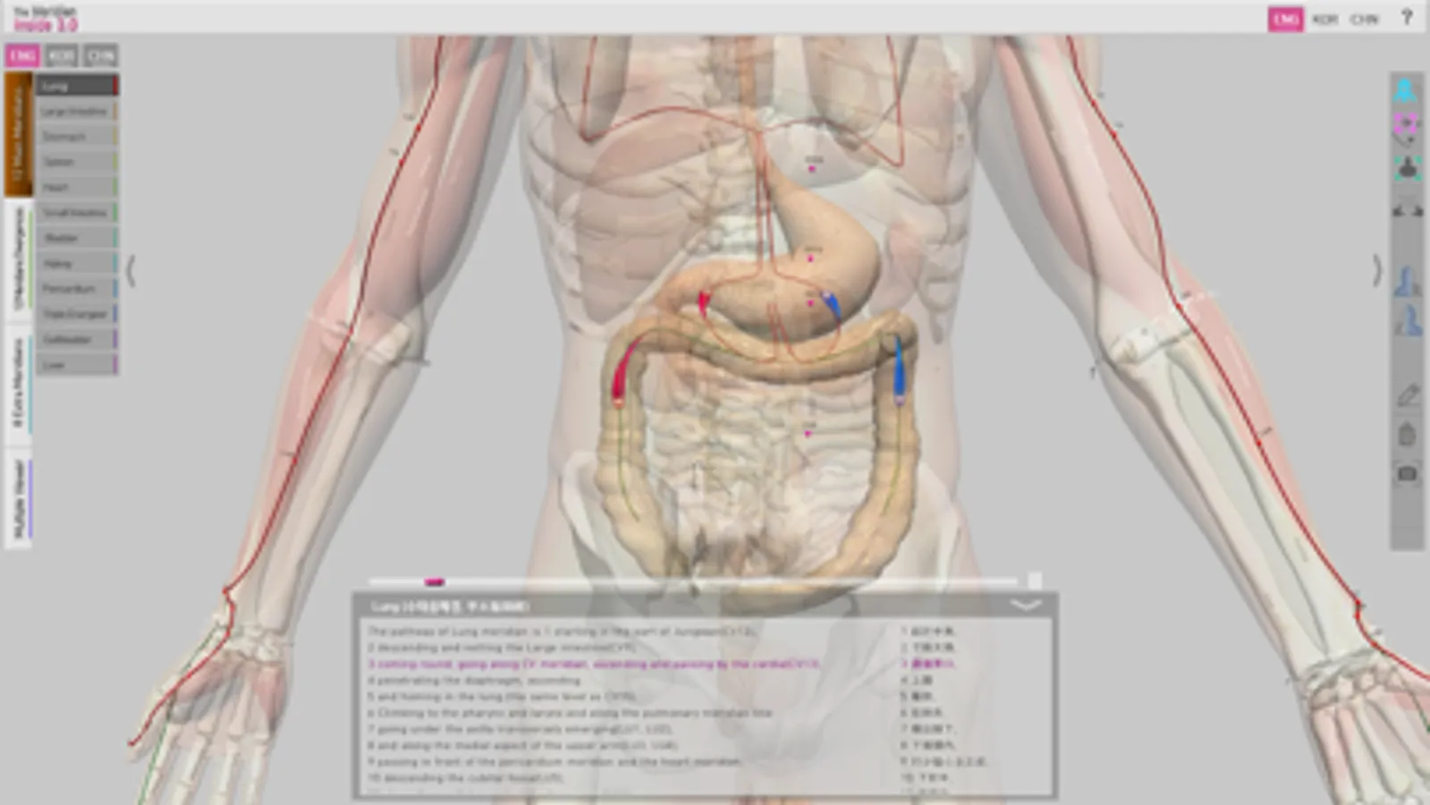 In 'The Meridian Inside of The VerdeRoot’, the skin, bones, muscle and internal organs of the 3D human model look realistic. The 14 Main Acupuncture Point Meridian, 12 Main Meridian, 8 Extra Meridian, and 12 Meridian Divergences are distinguished by rich colors so they are very easy to see. We adding some special menu for new runners, like “drive button bar” etc. So It is very helpful for begin studying The Meridian.