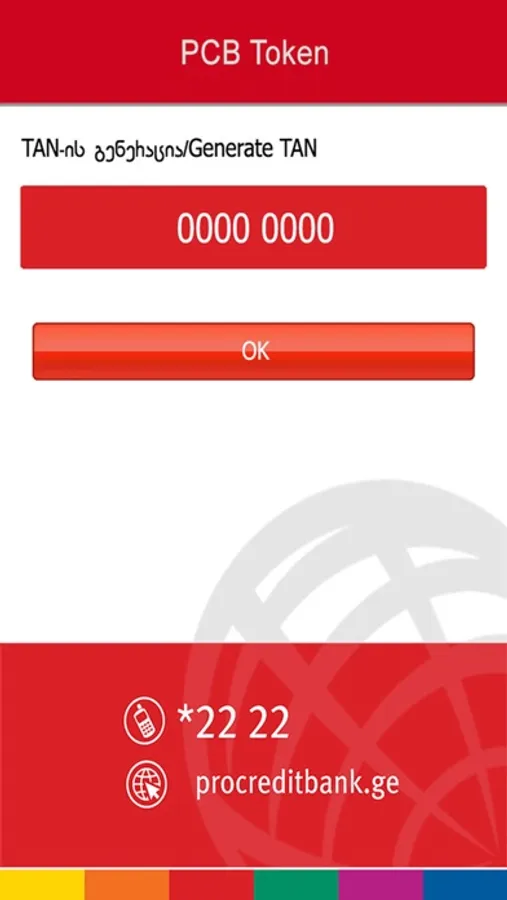ProCredit Bank Mobile Token generates a one-time TAN (transaction number) which is used to confirm transfers and other transactions over the Internet and through the mobile banking system. The TAN generated is an alternative to DigiPass and SMS TAN and allows you to confirm as many transactions as you want. Private and business clients using the full Internet Banking package can access this PCB Token generation application from Georgia and abroad without activating roaming.