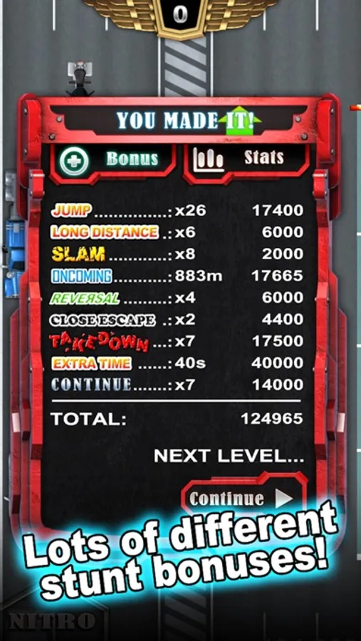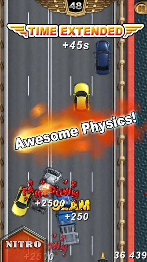 Tilt to steer and press the nitro button for extra speed. Tap anywhere on the screen to jump in that direction. Land on vehicles to take control of them, or else you're roadkill! Reach the next checkpoint before the time ends!