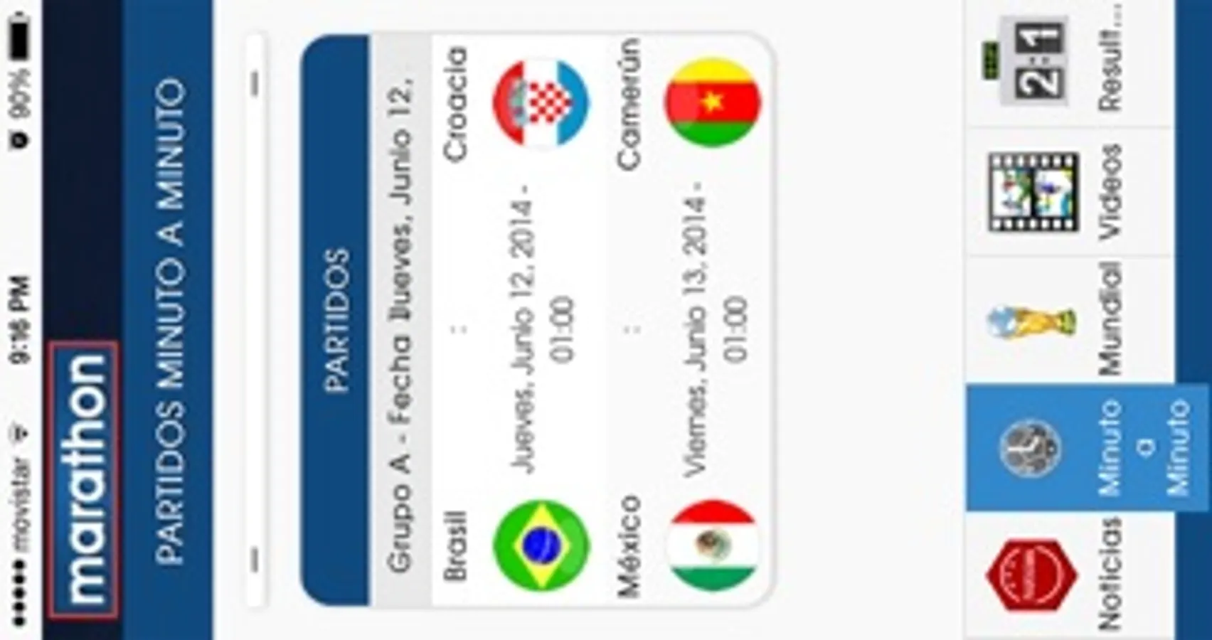 Aplicación para seguir el mundial Brasil 2014 . Sigue los Partidos minuto a minuto y comenta a través de Twitter! El app Marathon Sports te brinda Noticias exclusivas del Mundial y de la selección ecuatoriana de fútbol. Datos de los jugadores y equipos . Resultados y videos.