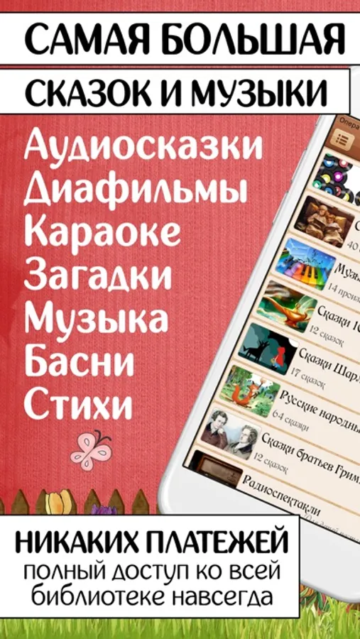 Более 1500 аудиосказок, 1000 мелодий и более 7000 других разнообразных детских произведений доступны сразу после покупки приложения.
