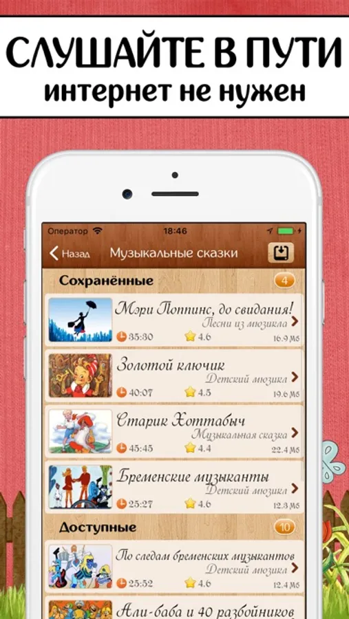 - Сохраняйте сказку и слушайте без подключения к Интернету