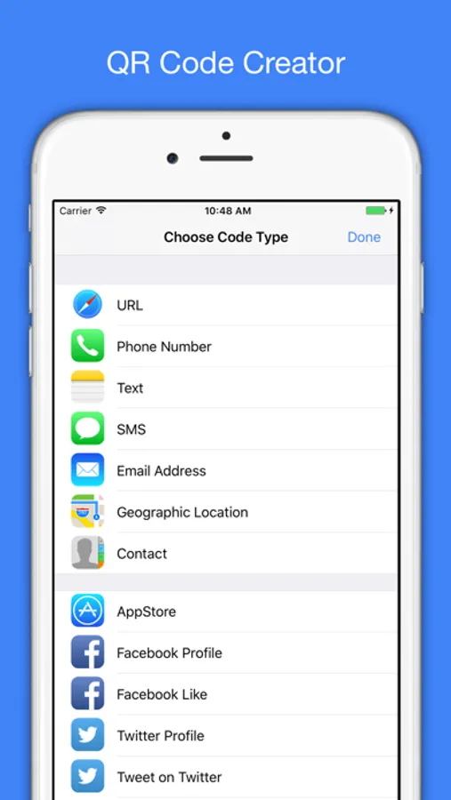 - Support create QR Code for: URL, Phone Number, Email Address, SMS Message, Text, Geo Location, vCard, MeCard, BizCard and WiFi.