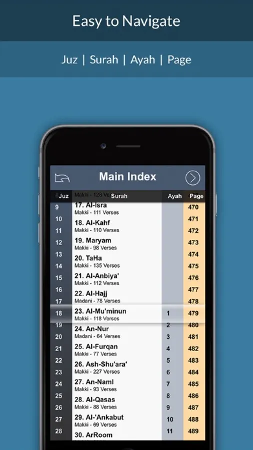 - Main index allows easy navigation to Juz / Surah / Ayah / Page