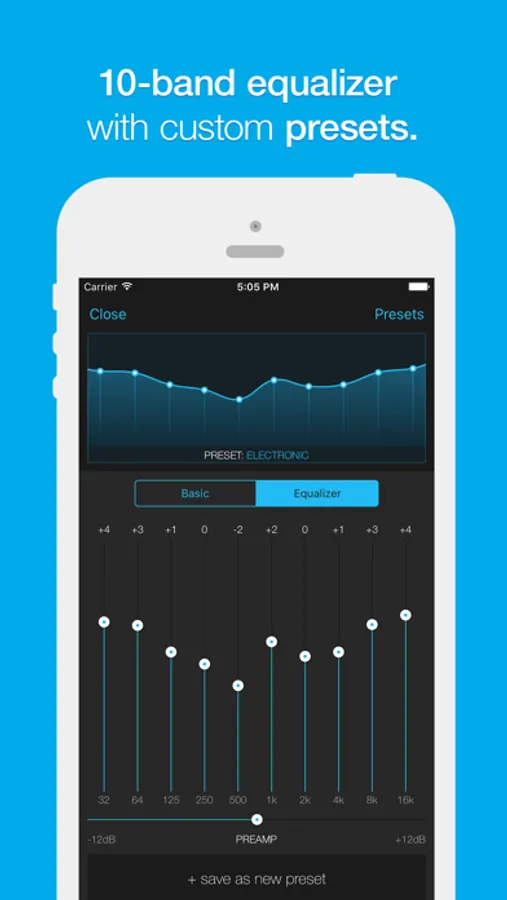 - 10-band Equalizer with Preamp, lots of built-in preset and ability to add unlimited number of custom ones