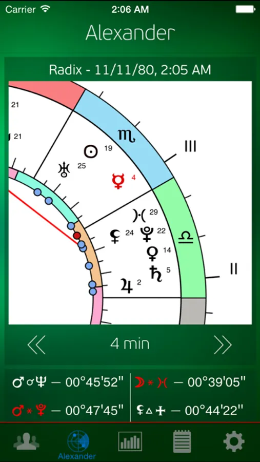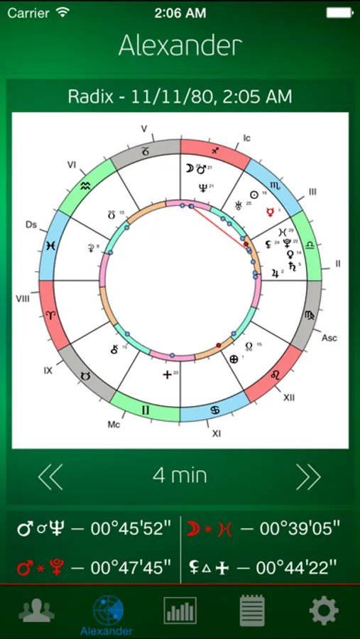 - swipe up to show ephemerides and aspects between planets and movable points (such as the moon's