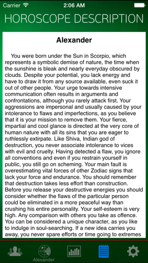 - displays the author's text description of the horoscope;
