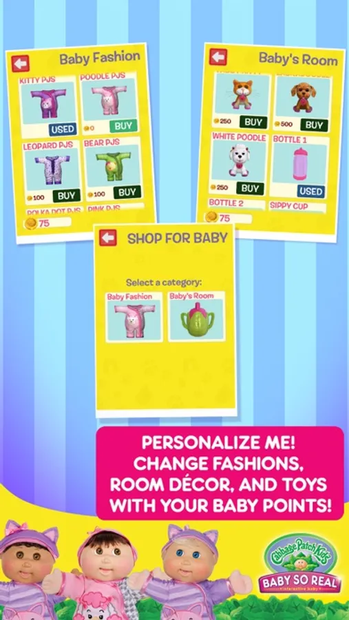 The free Cabbage Patch Kids® Baby So Real™ app acts as a virtual nursery where you can play with your baby, feed her, change her diaper, burp her, and share your love and care. You can also play Cabbage Patch Kids® games, watch video clips and earn Baby Points to get additional virtual accessories, fashions, room décor and more!