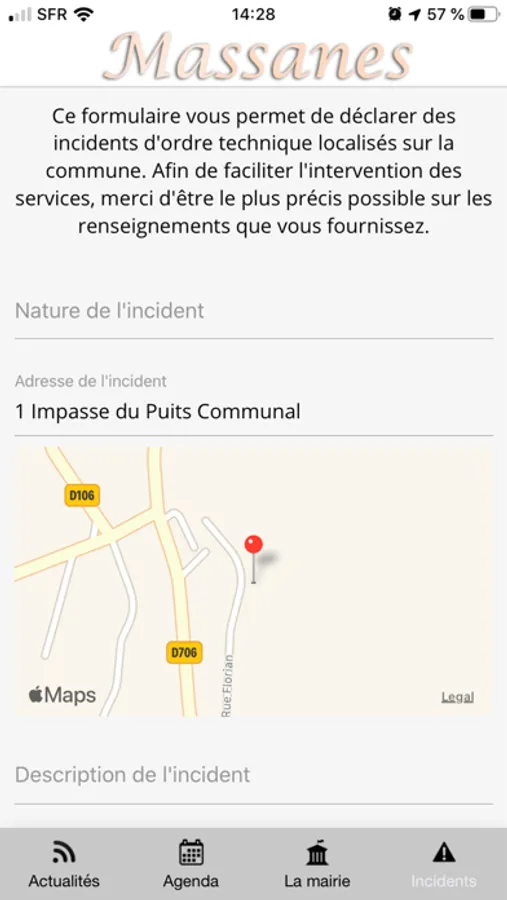 - Un nid de poule ? L'éclairage public est défaillant ? Utilisez la déclaration d’incidents et signalez le problème à la Mairie en un instant grâce à la géo localisation et en y ajoutant une photo prise sur le vif ou depuis votre bibliothèque;