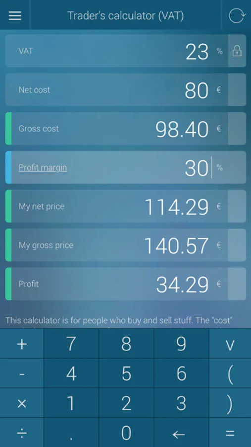 * a powertul trader's calculator (VAT or sales tax, net cost, gross cost, markup/profit margin, my net price, my gross price and profit all in one calculator)