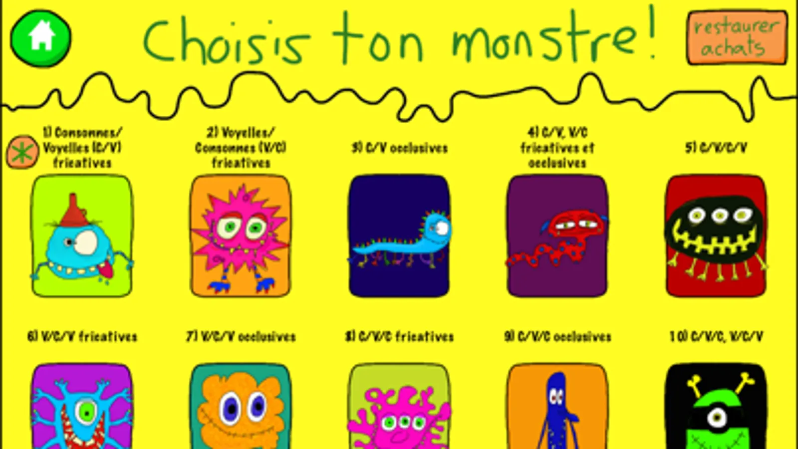 Il est possible pour l’adulte de déverrouiller préalablement tous les monstres d’une même ligne afin de proposer seulement un monstre précis à l’enfant en fonction de ses besoins particuliers. Par exemple, l’adulte aura déverrouillé les monstres 31 et 32 pour que l’enfant n’ait qu’à faire le monstre 33 travaillant les confusions spatiales et visuelles b, d, p, q.