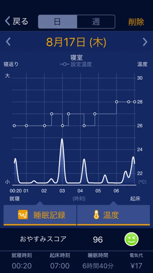 例)就寝後に室温を低めにコントロール。深部体温を下げやすい環境を整え深い眠りにいざなう。起床間近は少し温度を上昇させて、起床後の活動に移りやすい体の状態へアシストするよう自動で室温をコントロール