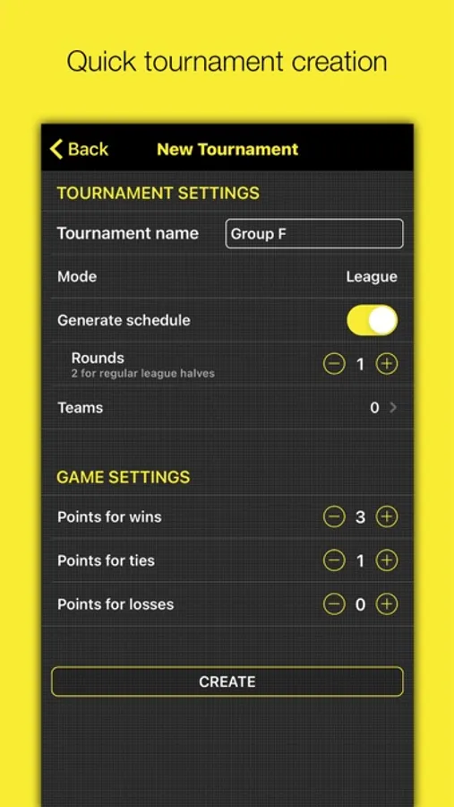 Quickly publish tournaments and let your friends follow their teams and matches live.