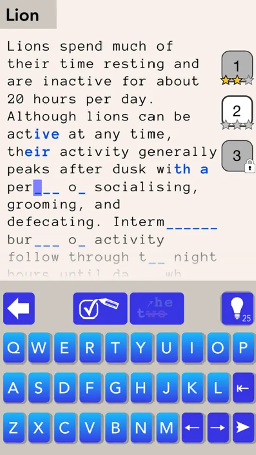 Take an interesting and authentic English text and erase parts of words. In Mind the Gap you have to reconstruct the missing fragments.