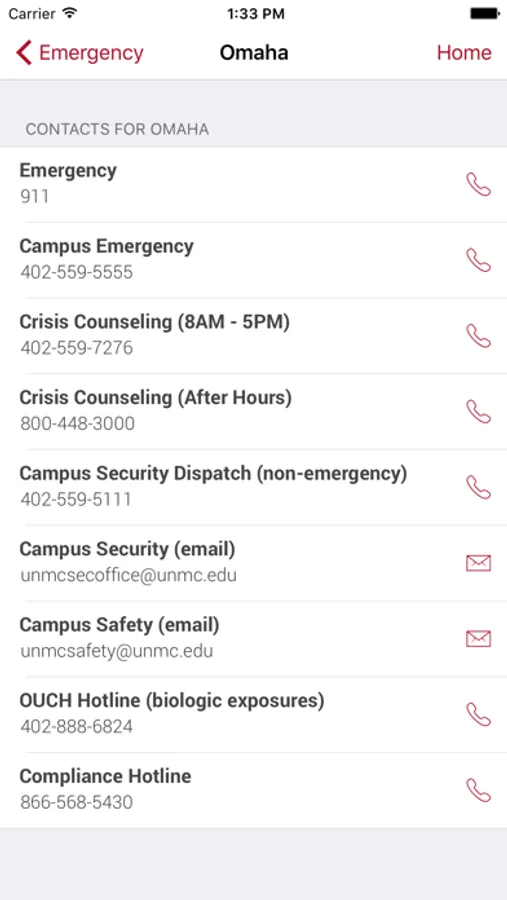 Emergency — Access important numbers when you need them. Call to report an emergency or get information from the UNMC Hotline.
