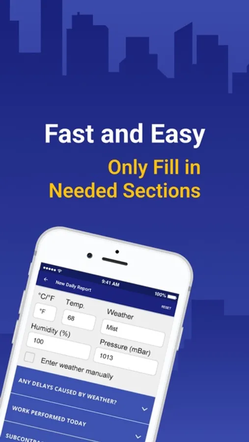 The app includes contractor details, site information, work performed, subcontractor progress, issues and punch lists, reasons for delays, additional work or change requests, materials purchased and received, labor and travel hours and more. The app captures weather conditions, locations, date and time, amount of labor performed and other field related information anytime from anywhere.