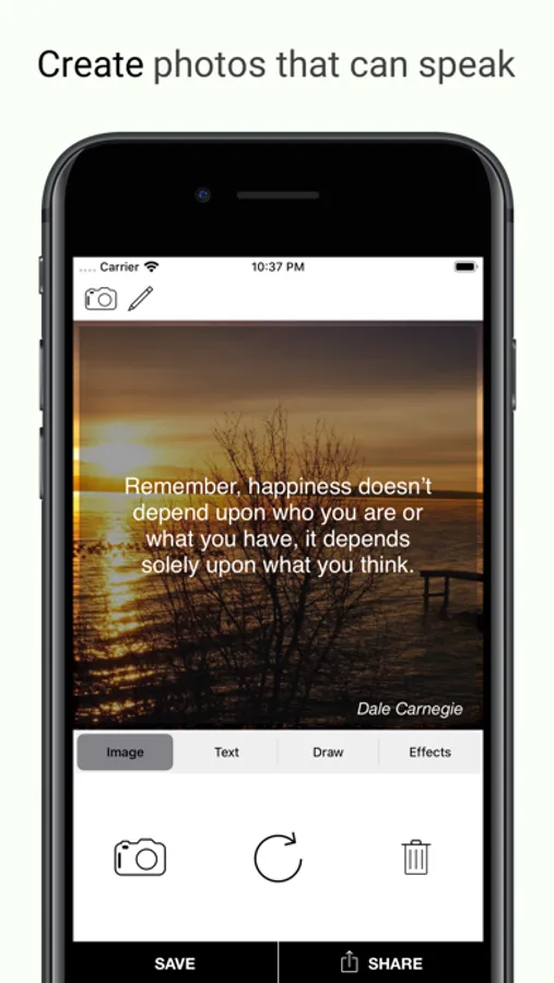 Choose a beautiful image from already existing in the App or use an image from your photo gallery. Select a quote of a known person or add your own saying. Change font, size, color or background for your text. Draw using very intuitive interface using different brush sizes and colors! Use all your imagination to make an amazing speaking photo and share it with your friends or subscribers!