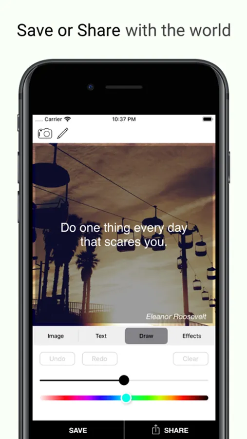 Share your amazing photos on Instagram, Facebook, Twitter, iMessage and Save them to the Camera Roll or iCloud.