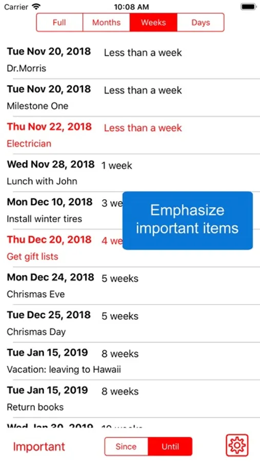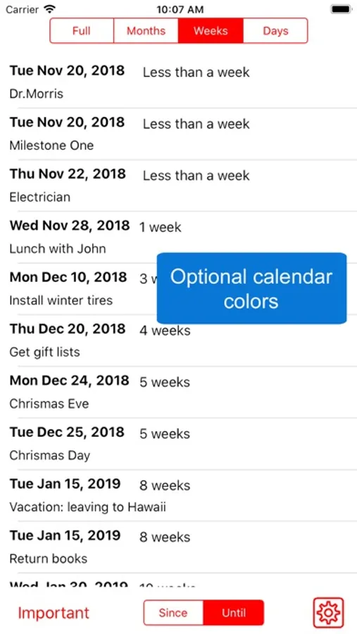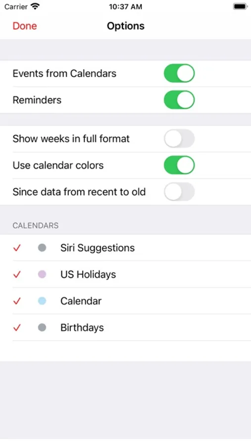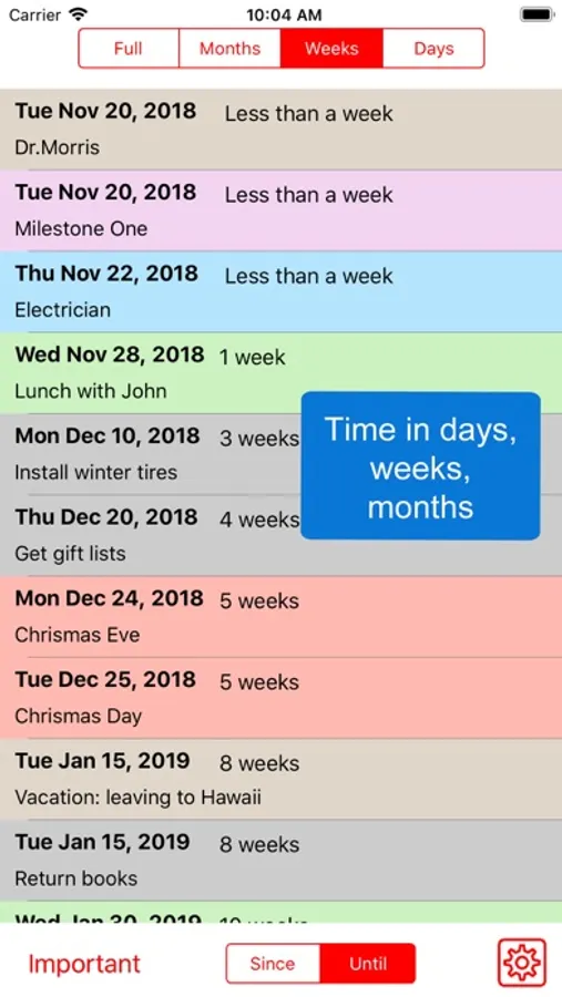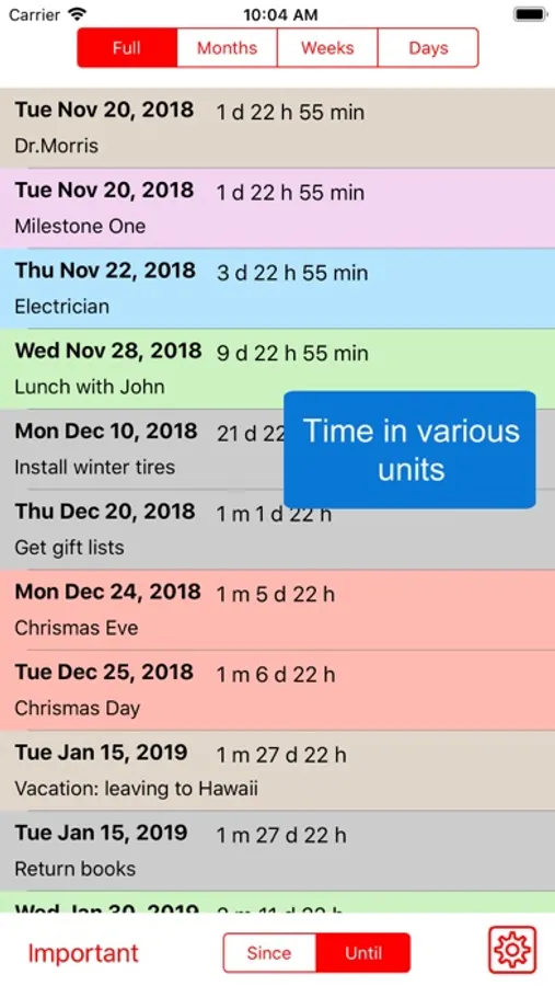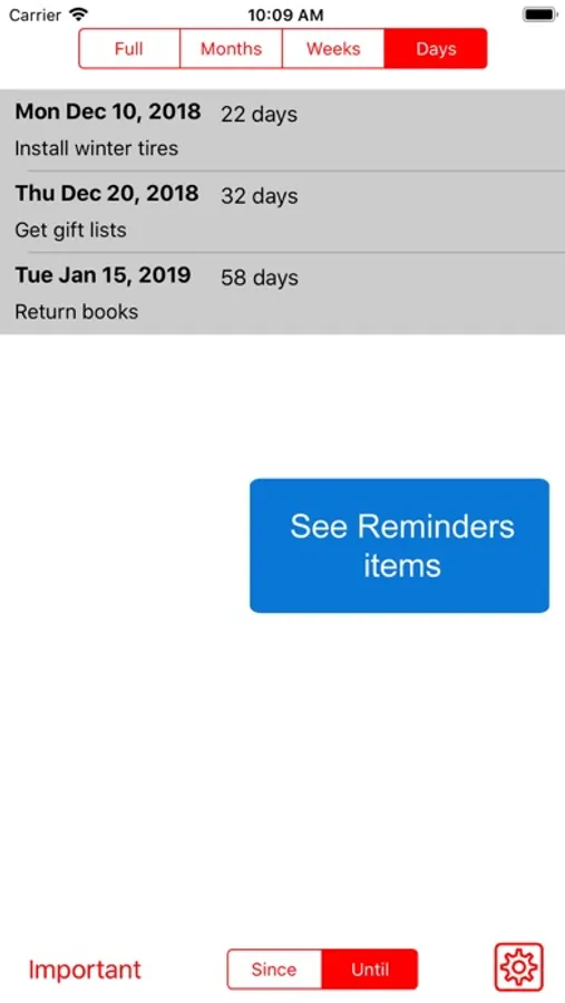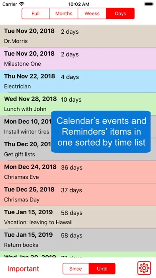 The app displays your Calendar's events and Reminders' items in one sorted by time list. You see them all at one glance with calculated countdown times and time passed since events.