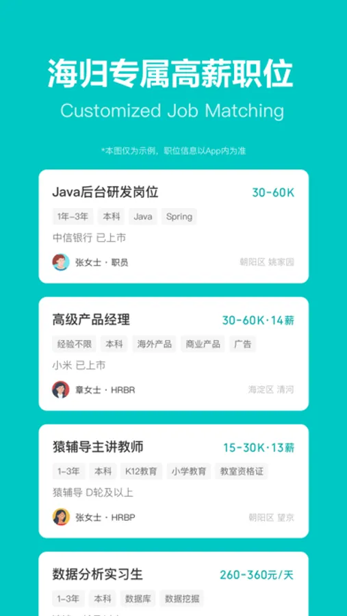 发现海归专区,定制回国求职信息,推荐海归专属职位,做自信的海归牛人。海量高薪职位,等你来撩!不等待,不犹豫,下载后直接开聊。