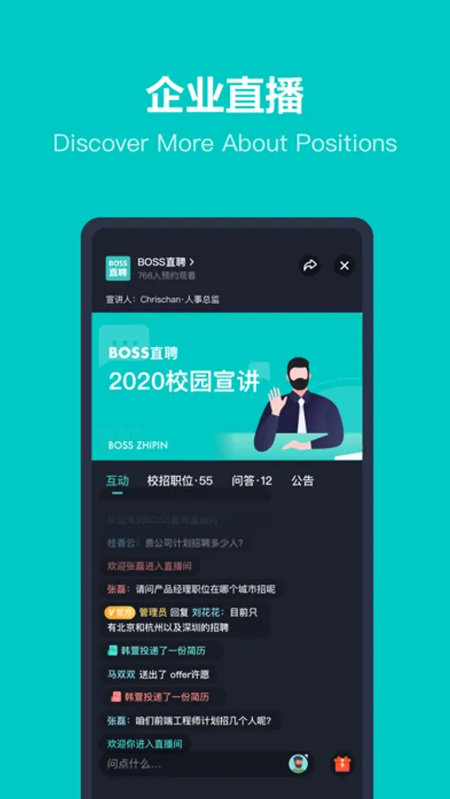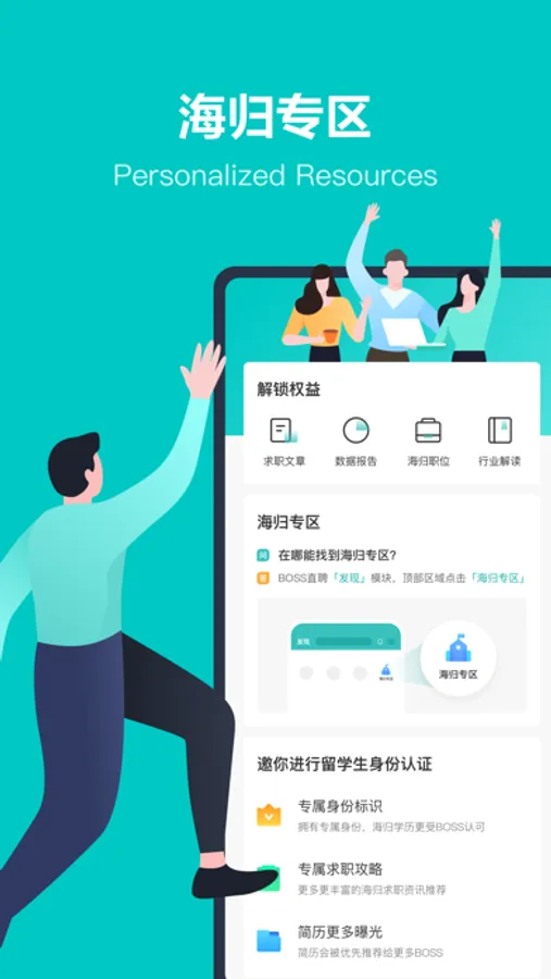 BOSS直聘是超爱留学生的互联网招聘求职APP,海归与招聘官精准匹配,高效快捷,随时随地,直接开聊。助海归快速找到合适的工作,顺利回到祖国的怀抱。