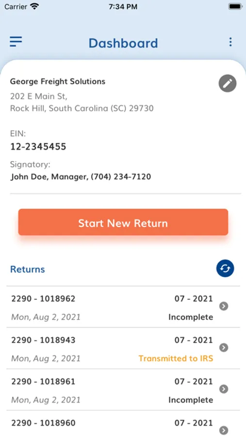 If you don't have an account with ExpressTruckTax, you will be prompted to create one and enter some basic business information including your EIN, Business Name, and Business Address.