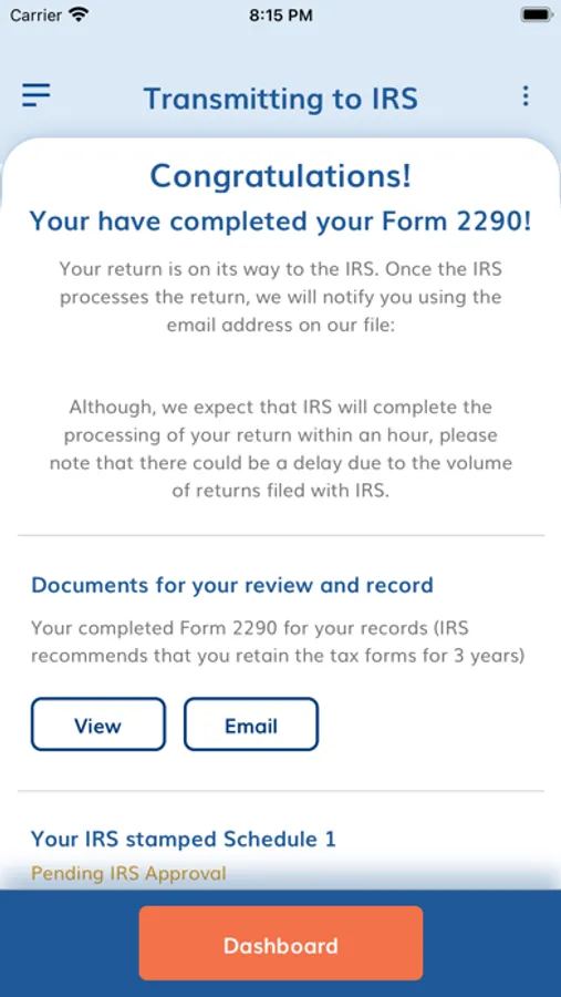 Before you transmit your return, you will be able to review it and make sure that your information is correct. When you are ready, click the Transmit button and it's off to the IRS for processing. The IRS typically only takes a few minutes to process your return, and your stamped Schedule 1 will be sent to your registered email.