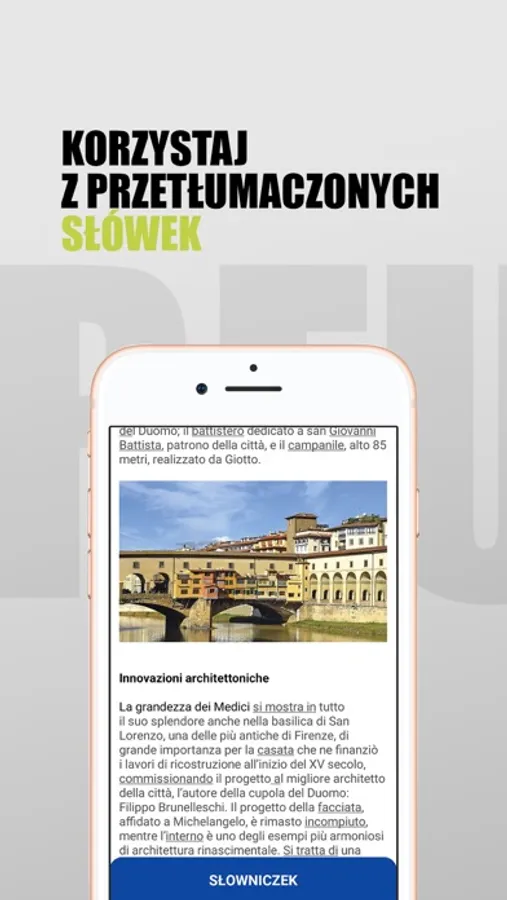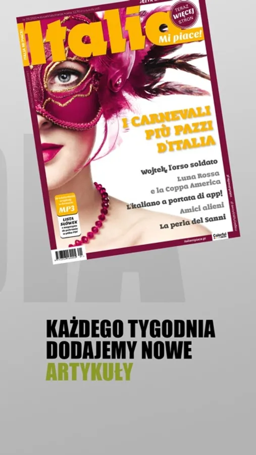 Aplikacja Italia Mi piace! to wspaniałe narzędzie do doskonalenia znajomości języka włoskiego. Udostępniamy Państwu setki artykułów o bogatej tematyce. Każdy z nich wzbogacony jest o słownik z tłumaczeniami najtrudniejszego słownictwa. Każdego tygodnia dodajemy nowe teksty.