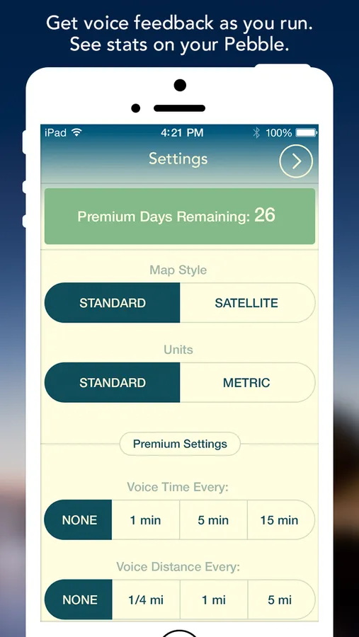 Don't want to look at the screen every few minutes? You can have the app tell you updates on your progress in set distance and/or time intervals.
