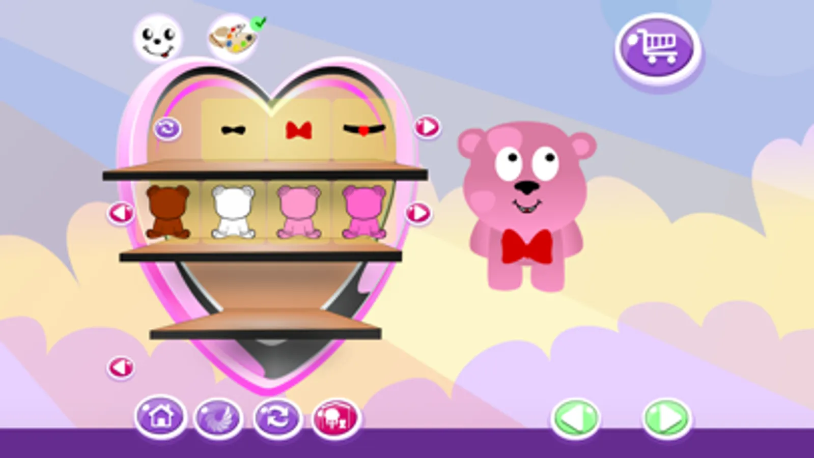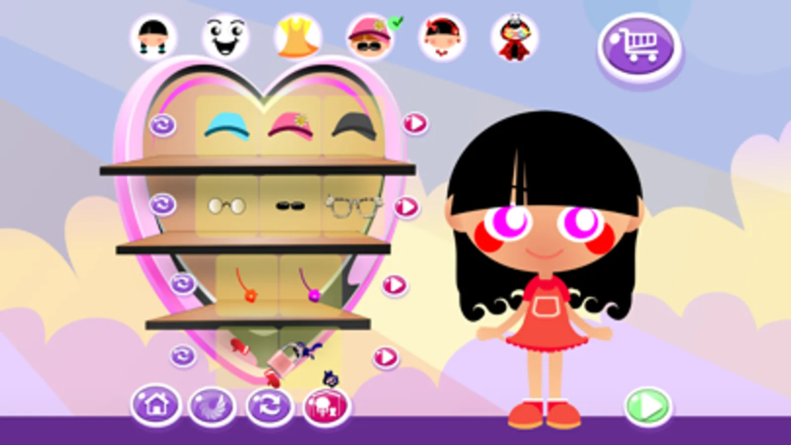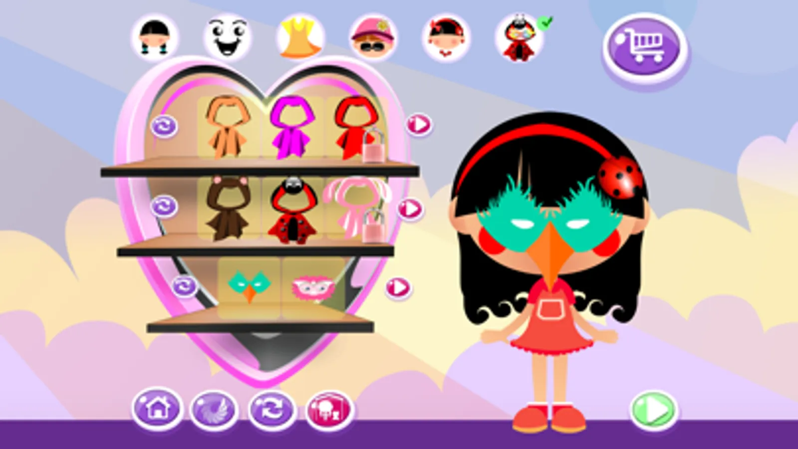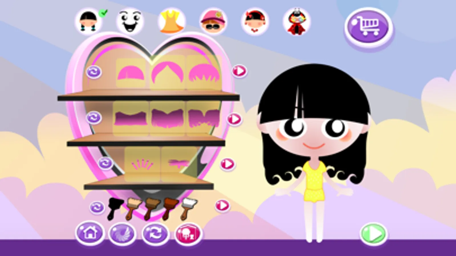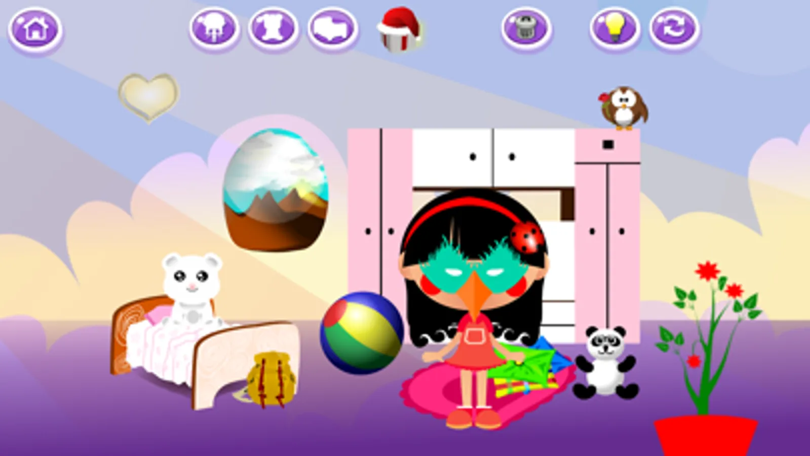 Not only you can dress up the doll and give her various expression but you can also dress up the teddy bear and change it to a pig-zebra or a funny little dinosaur or lady bug. You can change everything in the bedroom and modifying the colors as you want! Makeover everything to the latest fashion trend or in the funniest way.
