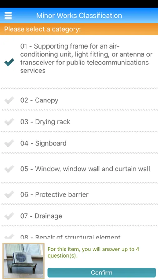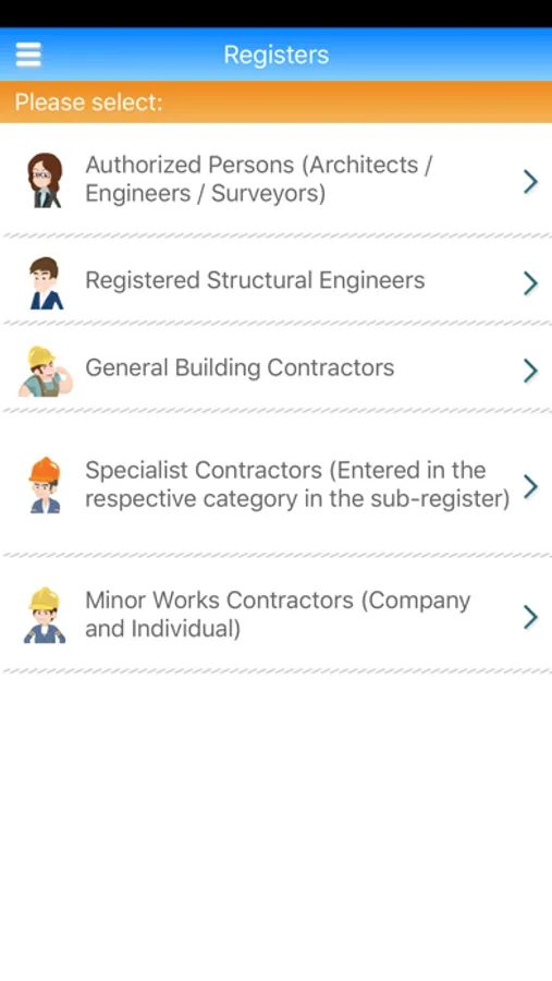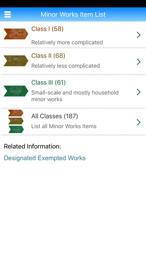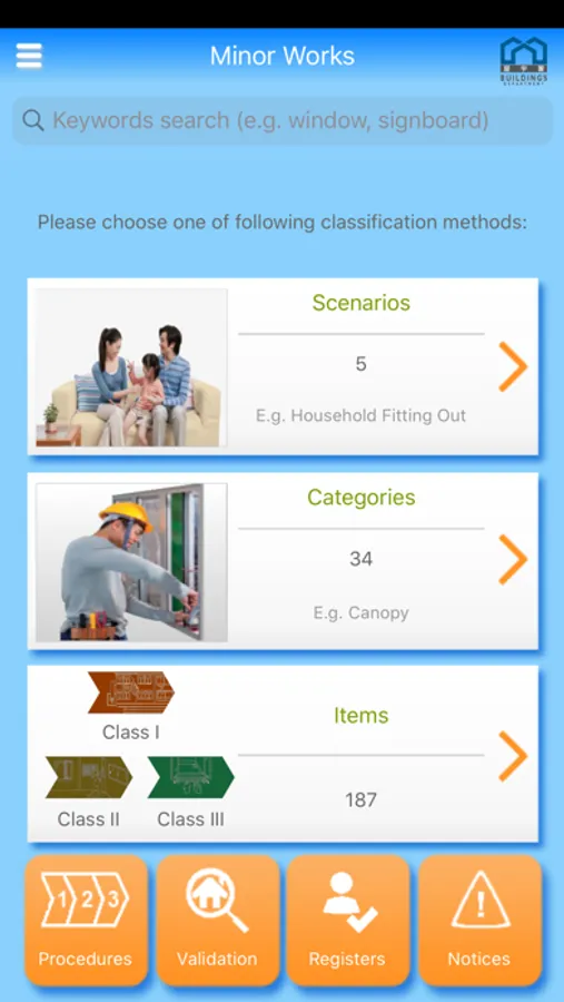 This App provides 3 quick search methods to enable users to identify the correct class/type/item number/description of the proposed minor works. Based on this information, users may then choose suitable building professional / registered building contractor to carry out the works.