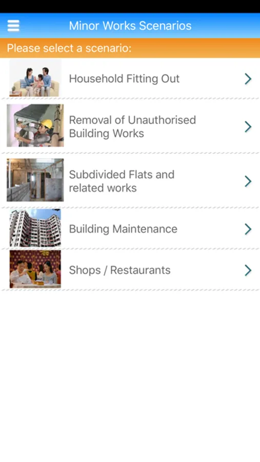 Users may also learn more about the required procedures for carrying out minor works, the Household Minor Works Validation Scheme / Validation Scheme for Unauthorised Signboards, using this App.