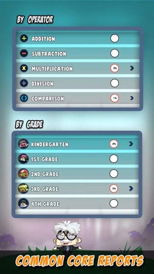 Math vs Zombies 2 is aligned with Common Core State Standards for Kindergarten, 1st Grade, 2nd Grade, 3rd Grade and 4th Grade and includes a detailed Report Card section where parents and teachers can monitor progress and find patterns of learning and help practice areas of weakness.