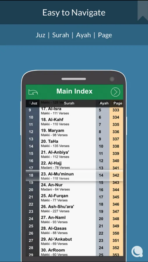 - Main index allow easy navigation to Juz / Surah / Ayah / Page