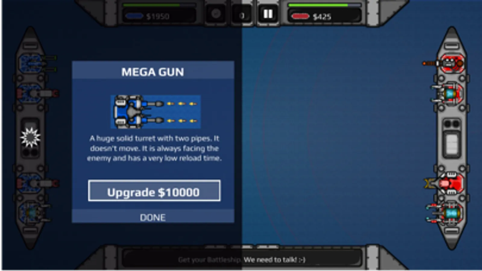 On a playround two oponens face each others battleships. Each battleship has four turrets. At the beginning these canons are normal canons, but can be specialized and upgraded during the game. The turrets swing on a 90 degrees angle by themselves. The player can fire a canon by touching it. A fired canon needs to cool down for three seconds (greyed out). To hit the enemys battleship the player has to time the touching to lunch missiles to the right direction. Rockets can be catched and stopped by other rockets. If two rockets collide that player gets some gamecash the side the collision happened on. Players can buy turret upgrades from this gamecash every 60seconds (end of playround) on a special upgrade menu. If a player brings the lifebar of the enemy to zero the battleship explodes and the player wins.