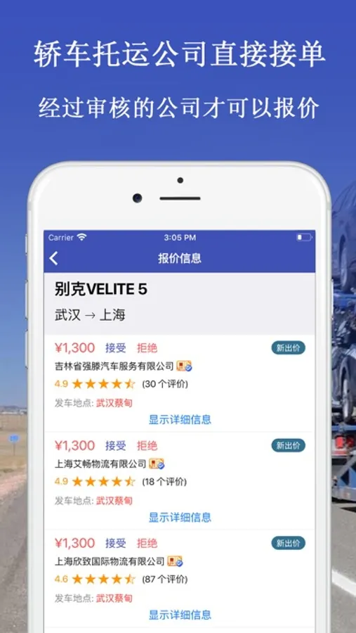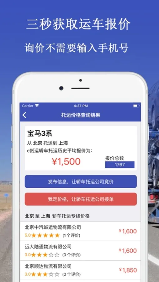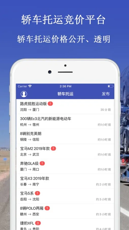 2. 免费发布轿车托运需要,等待轿车托运公司出价通知。