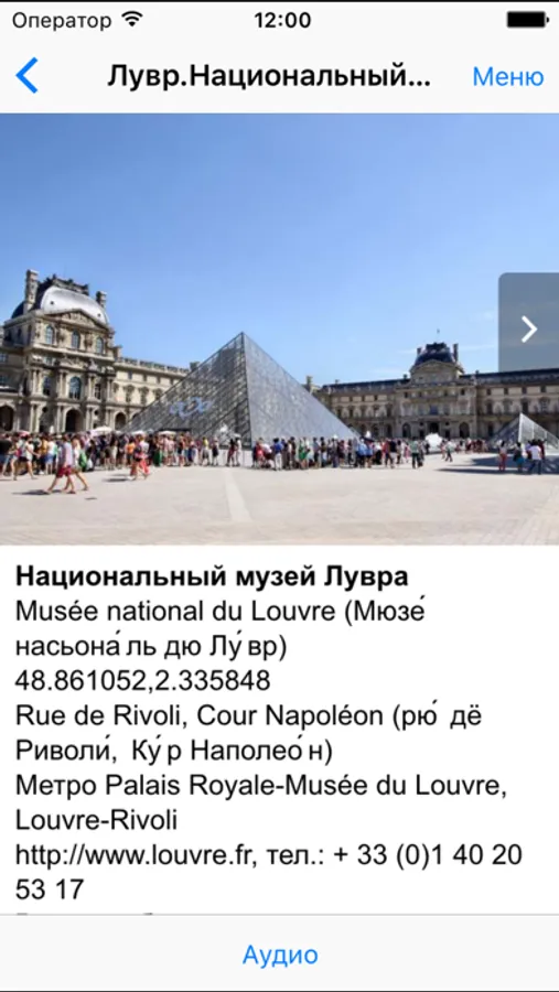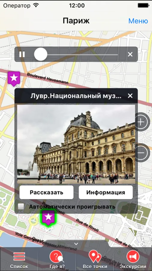 ● АУДИОГИД ПО ПАРИЖУ. Рассказы аудиогида озвучены профессиональным диктором. Слушайте рассказы не отвлекаясь от осмотра достопримечательностей и не теряя время. Не стоит портить зрение, читая на ходу текст на небольшом экране.