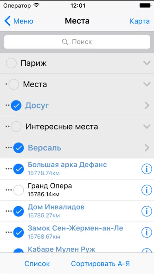 ● ПРОГУЛКИ ПО ПАРИЖУ. В нашем путеводителе очень просто составить свой собственный план прогулки по Парижу, отметив в каталоге нужные места, которые сразу будут отображены на карте. При этом остальные объекты вы можете временно убрать с карты.