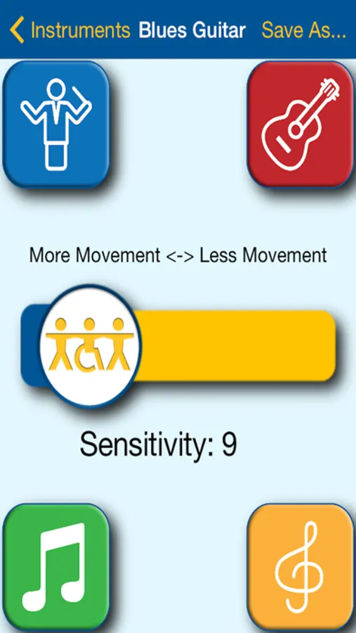 Clients and their music therapist (or caregiver) can choose: from among 30 instruments; the base key; the scale type; and the type and intensity of movement that will activate the notes. They can change any of these options at any time. In addition, the app includes features for more advanced users, such as MIDI output over WiFi.