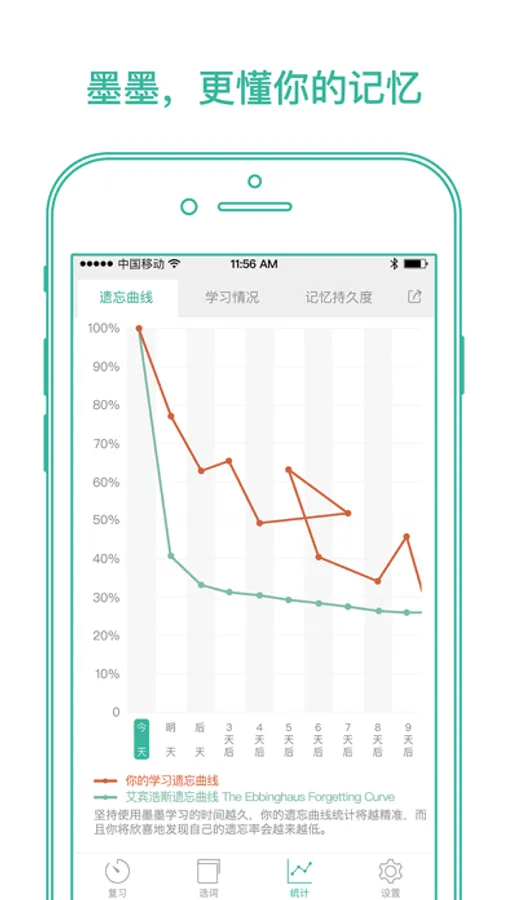 * 遗忘曲线:真实反映了你在每个阶段对已学单词的遗忘率;